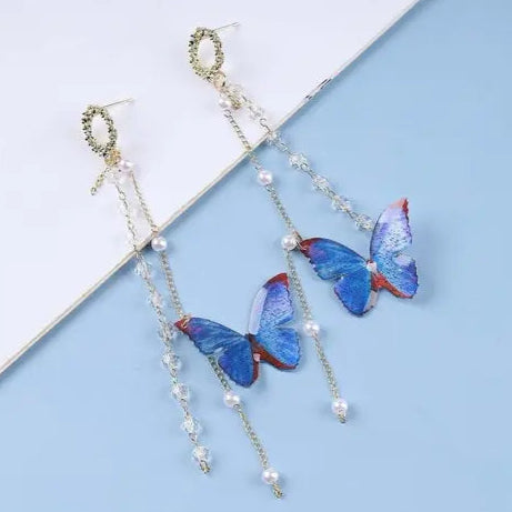 Experience the beauty and elegance of these enchanting Blue Butterfly Long Earrings. Flutter with grace as these earrings delicately hang, adding a touch of sophistication to any outfit. Perfect for any occasion, these earrings are a must-have for any jewelry lover.